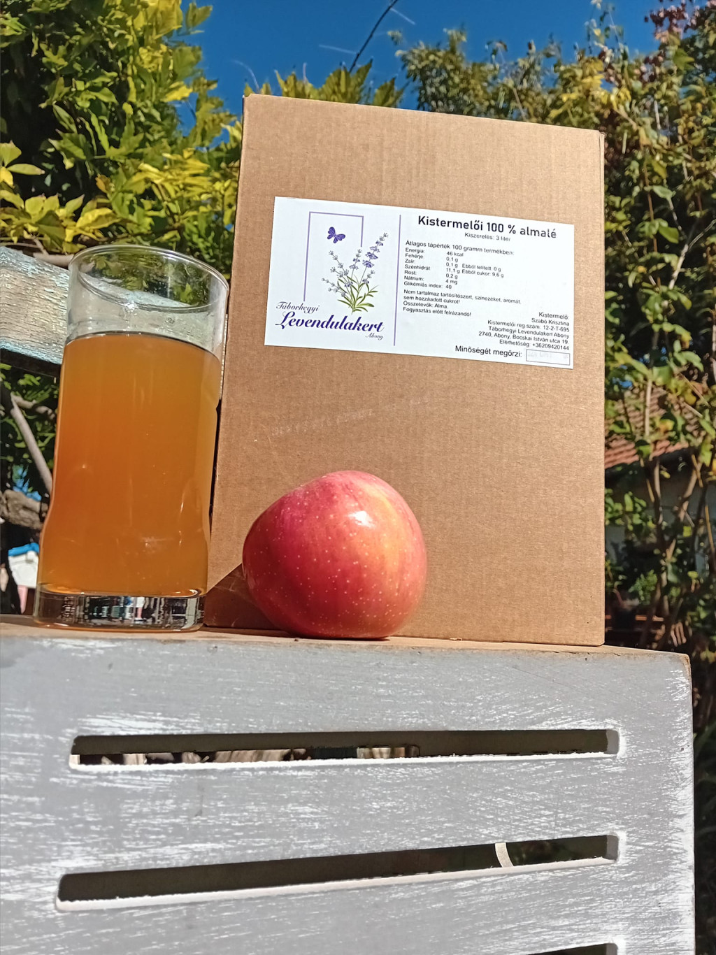 100 % kistermelői szűrt almalé. Édes almából készült, szeretettel. Nem tartalmaz cukrot, tartósítószert, édesítőszert, ogrét. Csak az alma. :)