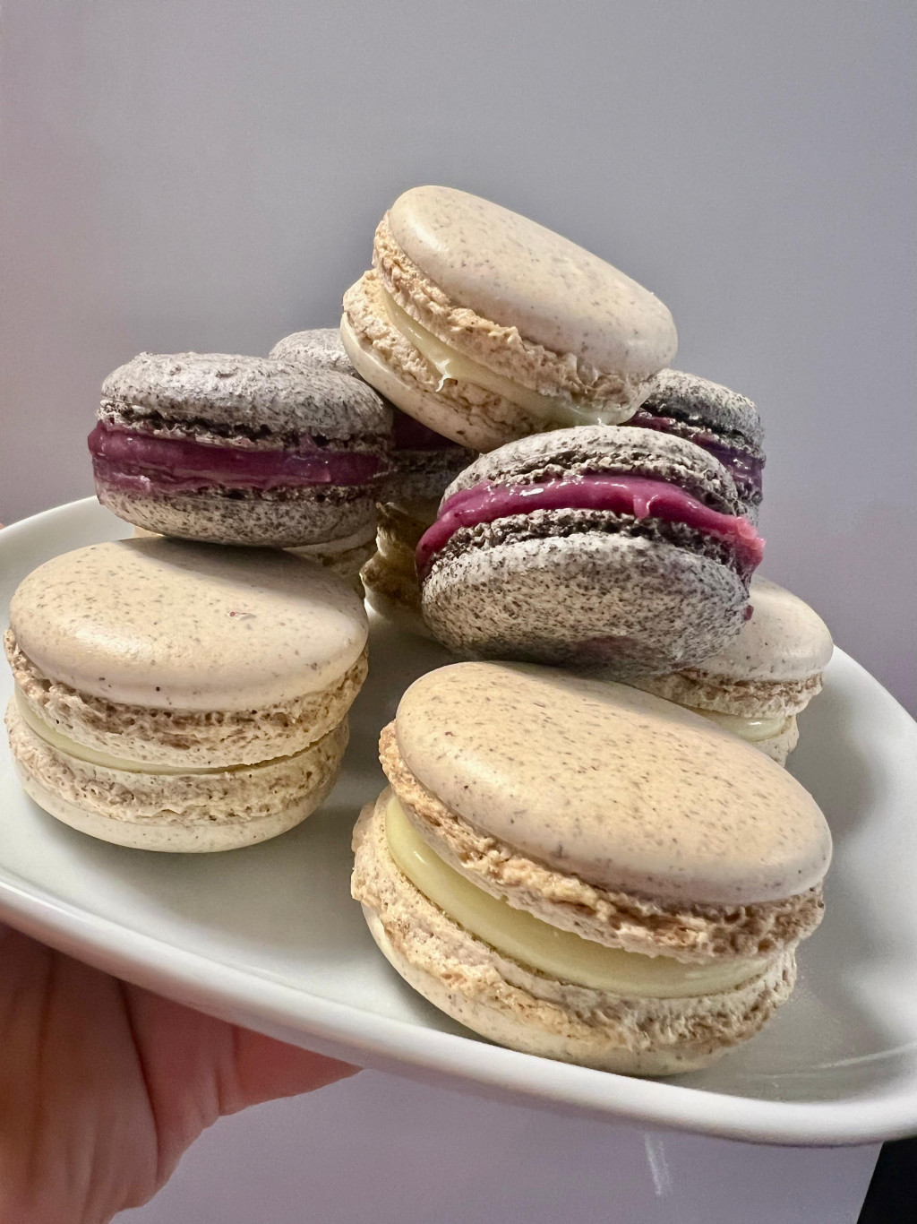 Előrendelhető! Fürjtojásos macaron – vegyes válogatás (6 db) Különleges, kézműves macaron válogatás. A diós, mákos és mandulalisztes változatok változatos ízélményt adnak, miközben a macaronok könnyed, roppanós héja és krémes tölteléke tökéletes harmóniát alkot. A dobozban vegyes töltelékek találhatók: nutellás, erdei gyümölcsös és citrusos fehércsokis ganache, hogy minden falat egy új ízélményt adjon. Elegáns ajándéknak, kávé mellé vagy különleges alkalmakra is ideális választás. Lisztet nem tartalmaz. Összetevők: mandulaliszt, dió, mák, porcukor, fürjtojás, csokoládé, gyümölcsök, cukor, tejszín, természetes aromák Kiszerelés: 6 db / doboz Tárolás: hűtve, +2–6°C között