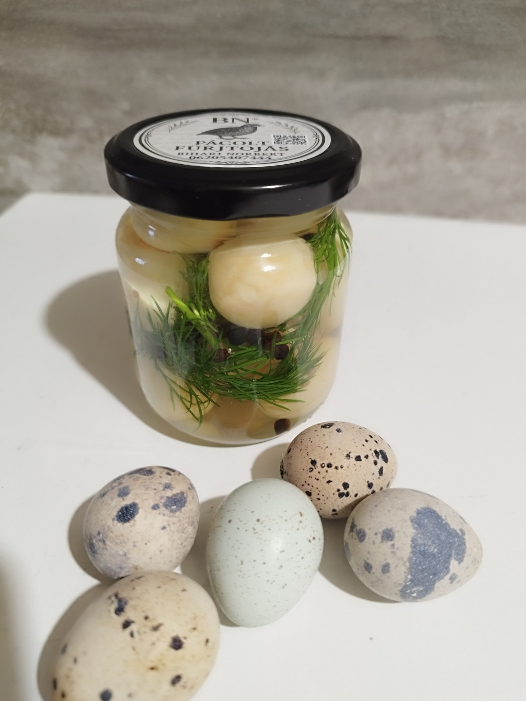 Kapros–mustármagos savanyított füstölt fürjtojás Gondosan előkészített fürjtojások enyhén savanykás, harmonikus lében érlelve. A friss kapor üde, zöld aromája és a mustármag enyhén pikáns, fűszeres karaktere különleges, mégis kiegyensúlyozott ízvilágot ad. Kiváló hidegtálakhoz, salátákhoz, szendvicsekhez, sörkorcsolyának vagy akár önmagában, egy falat friss kenyérrel. Kézműves kisüzemi termék, adalékanyagok nélkül. Összetevők: fürjtojás, ivóvíz, ecet, só, cukor, friss kapor, mustármag, fűszerek Tárolás: hűtve, +2-6 fok