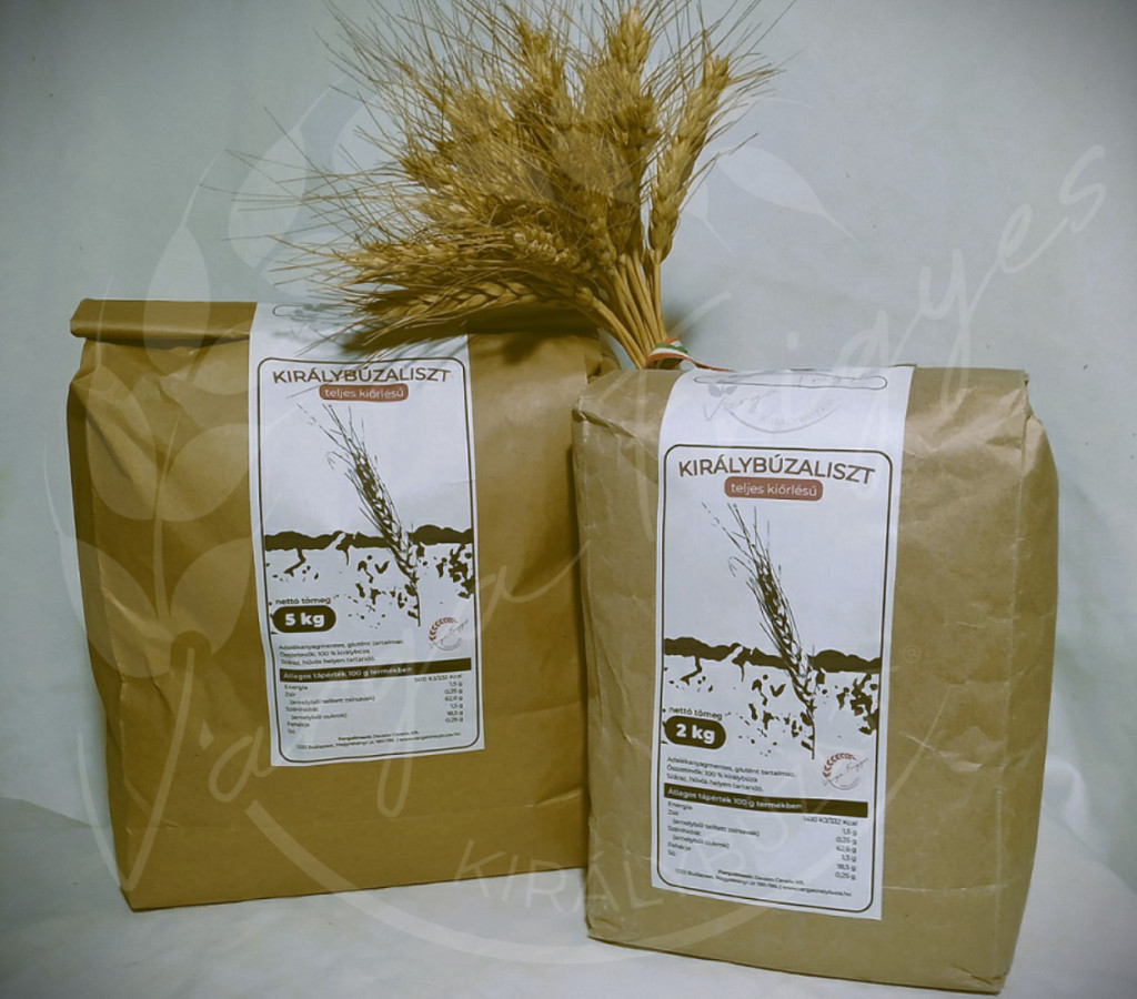200-as kiőrlésű Varga Frigyes királybúzája® teljes kiőrlésű királybúzaliszt A királybúza egy ősbúza keresztezés, mely mögött a nemesítői-fejlesztői cél nem volt más, mint a tönköly megszelídítése, fogyaszthatóbbá tétele ⇒ a tönköly kedvezőbb élettani hatásainak keresztezése a felhasználóbarátabb, jobb sütési tulajdonságokkal bíró más, szintén erős búzatípusokkal. általános minőségi jellemzők: fehérjetartalom 14 - 18%; nedves sikér 30 - 38%; terülés 1,5 - 3,5 mm/ó; esésszám 300 - 450 mp formatartó tulajdonságokat kapott, eltérő a fehérjeszerkezete színe sárgás (durumhoz hasonló) közelebb áll a hazai konyha kívánalmaihoz, ízléshez konkrétan egyedi, jellegzetes íze van a királybúzalisztnek önmagában is univerzális; más lisztek, vagy extra sikér stb hozzáadása nélkül is felhasználható mindenre (száraztésztára is) - esetleg kisebb tesztelés, próba szükséges míg az ember kitapasztalja, hogy adott recept egyes hozzávalóiból mi lesz az ideális mennyiség A nemesítő indikatív alapreceptje sima kenyérhez: 1000g királybúzaliszt 650ml víz 12g só 15g élesztő (igen, bármilyen meglepő is lehet, ha megfelelő az élesztő akkor ennyi is elég, szépen meg fog kelni vele a tészta)