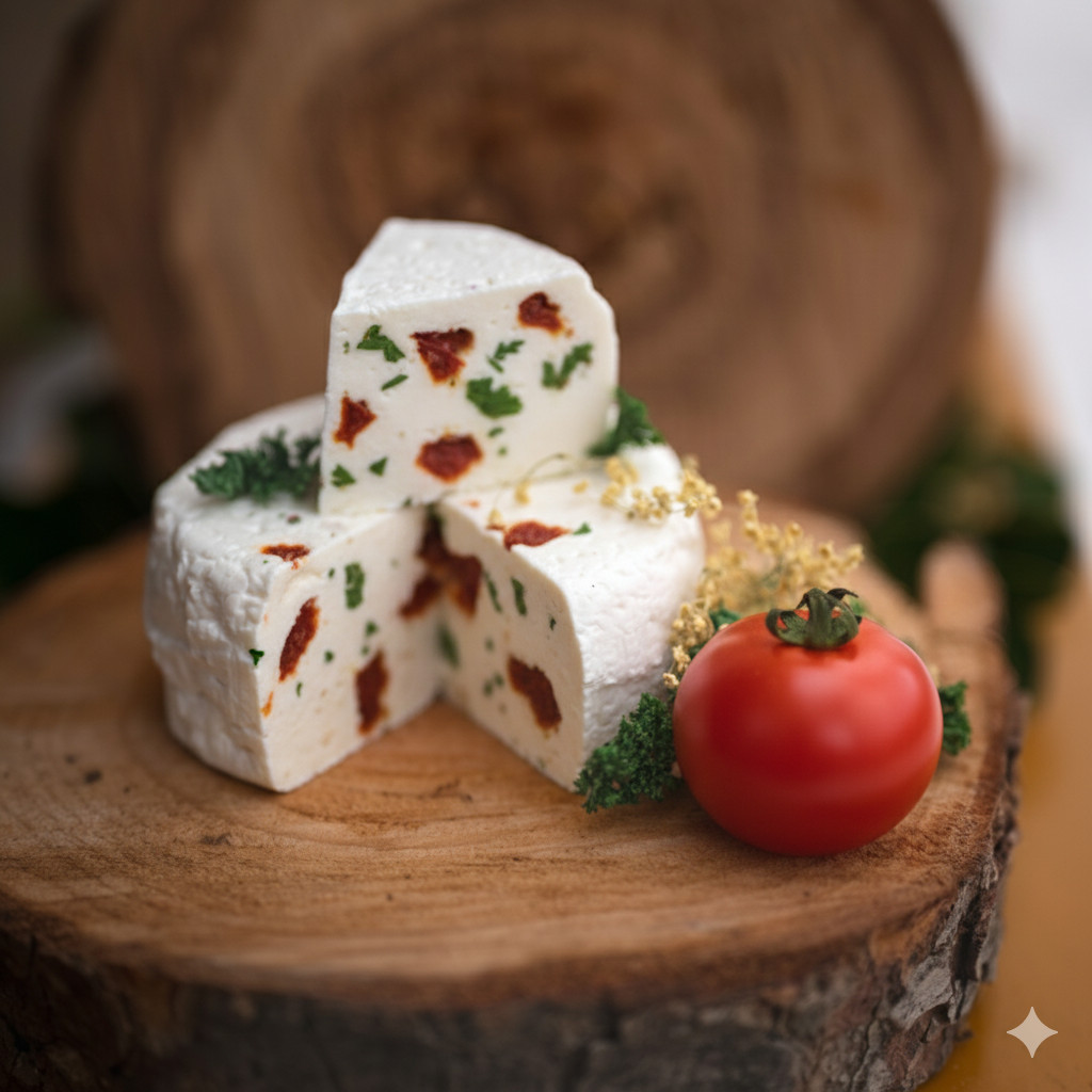 Mediterrán gomolya sajt Lágy gomolya sajt válogatott mediterrán fűszerekkel (aszalt napon szárított paradicsom, bazsalikom, oregánó), amelyek karakteres, mégis kiegyensúlyozott ízvilágot adnak. Kiváló salátákhoz, hidegtálakhoz vagy önmagában fogyasztva. 1db sajt ~25dkg  Pontos ár mérés után kalkulálható.